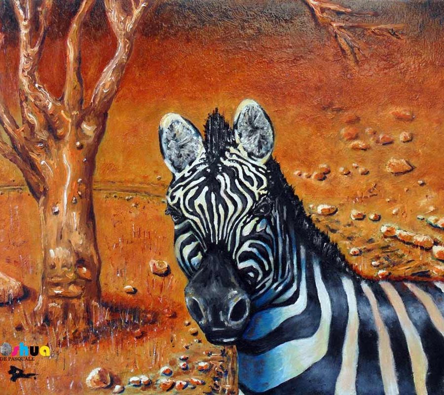 Berny, oil on canvas. By Josh De Pasquale. A zebra against a bright orange land.