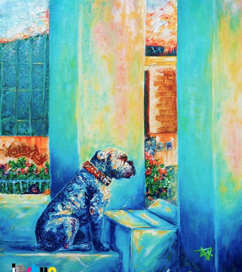 Champ - oil painting on canvas by Josh De Pasquale. A bulldog in Spain, waiting for friends to return.