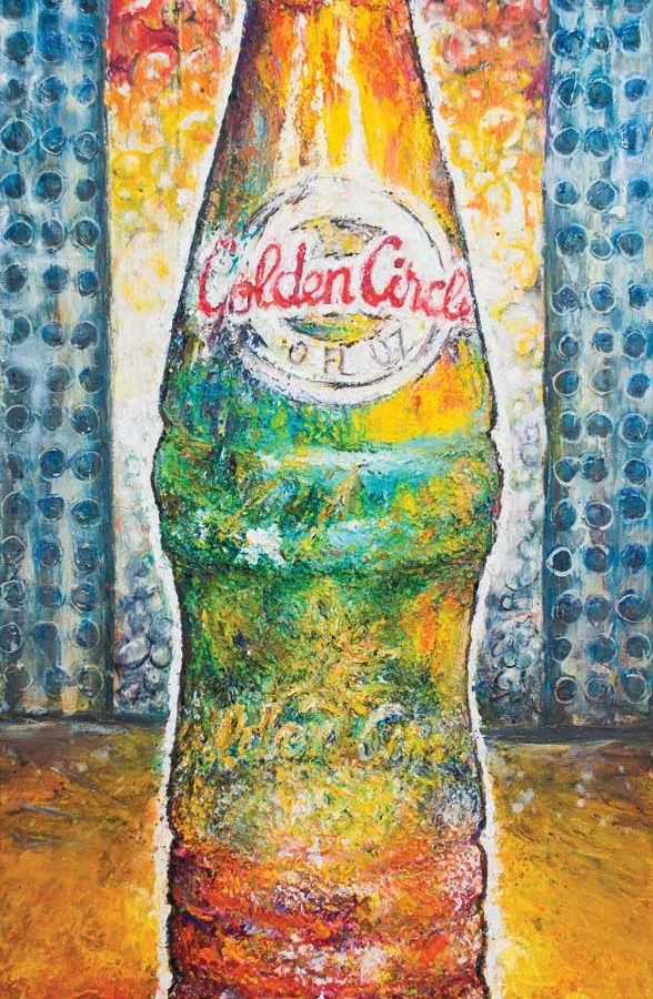 Golden Circle Bottle, on on canvas painting by Josh De Pasquale. Still life objects.