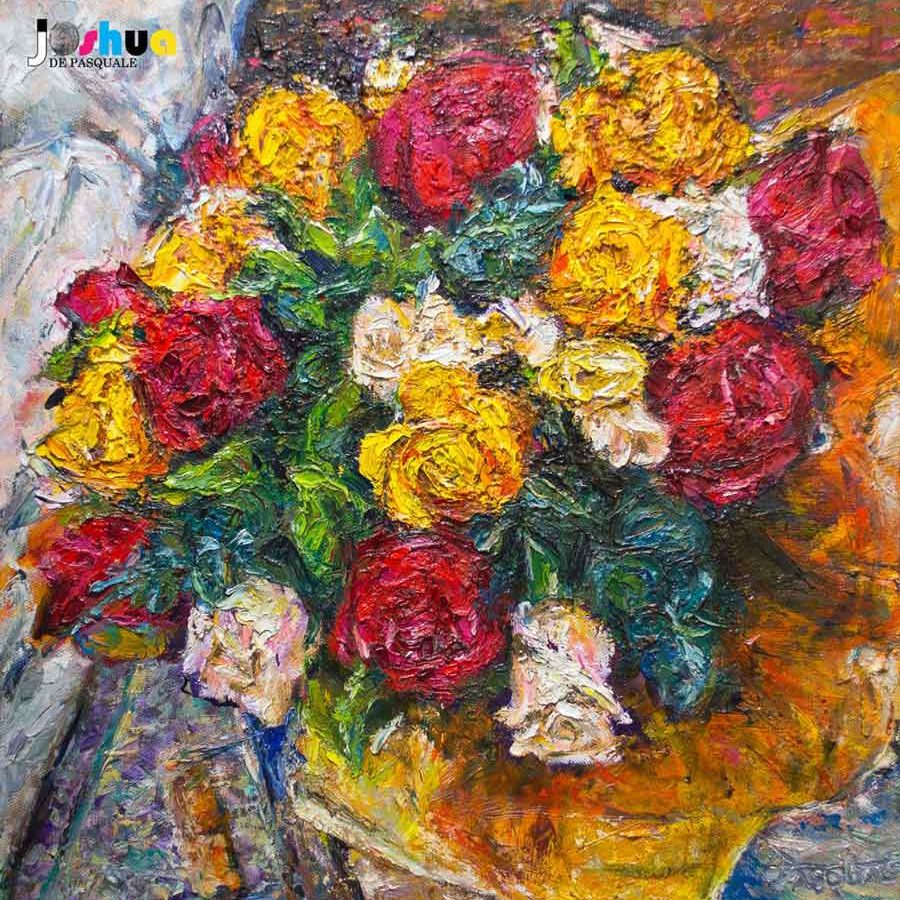 Jen's Roses. Oil on canvas by Josh De Pasquale. Still life of a sensational bunch of roses.