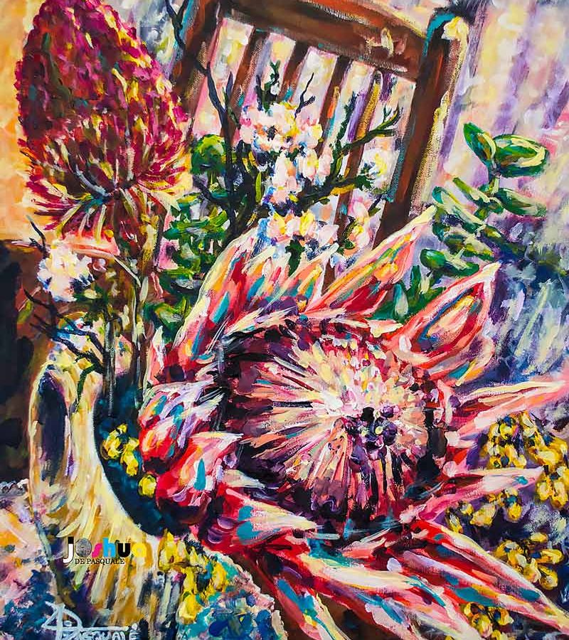 King Protea - acrylic painting on canvas by Josh De Pasquale. Still life, Austrlaian protea and banksia flowers with wattle and acacia.