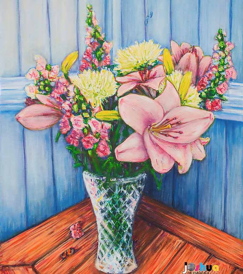 Ash Pink Lillies - acrylic on canvas board by Josh De Pasquale