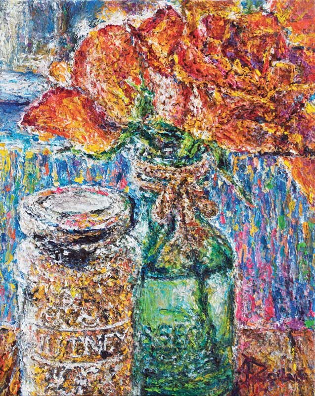 Sugar Chutney - oil on canvas board of a still life involving repurposed jars and bottles, featuring orange roses